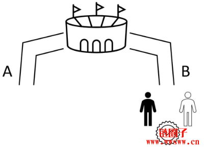 继续以前面的例子为例,客人与小拓一同到了秘密派对的举办地点。由于派对在一座山上的别墅中举办,分别有A、B 两条路可以通向别墅,但如果要从A 到B 或是B 到A,都需要穿过别墅才行,但只有知道密语的人才能穿过别墅 ( 如下图示) 。